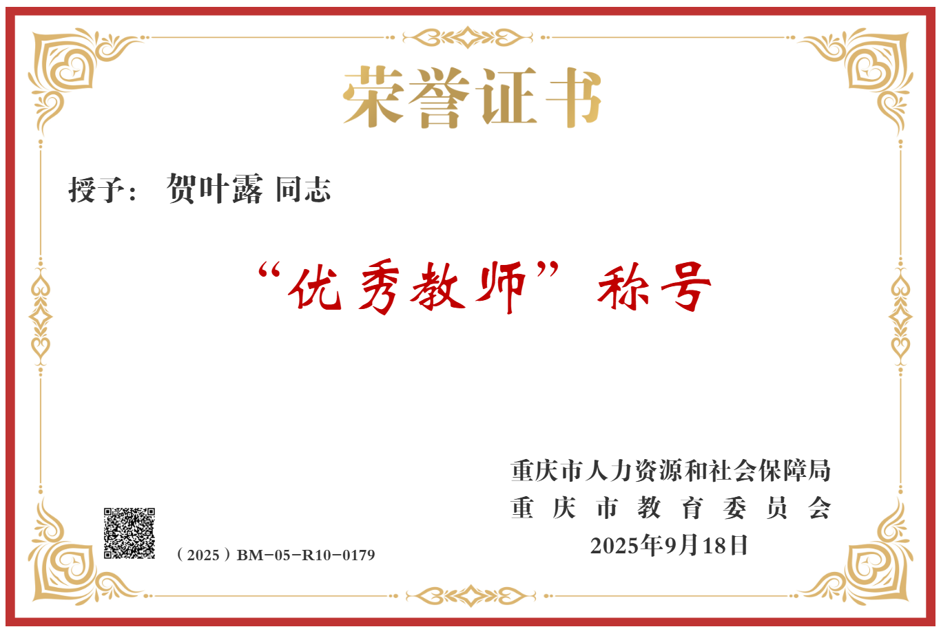 根据《重庆市人力资源和社会保障局重庆市教育委员会关于开展教育强市建设先进集体和先进个人评选表彰的通知》(渝人社〔2025〕295号)文件精神,2025年重庆市优秀教师评选结果正式揭晓,我院437必赢会员中心贺叶露副教授斩获重庆市“优秀教师”称号。