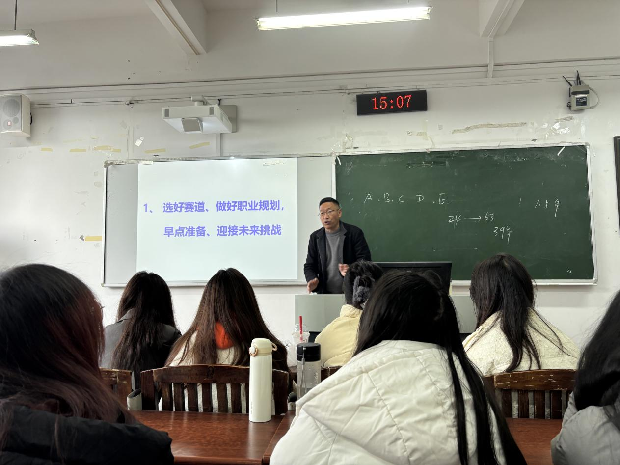 为帮助师范生明确学习方向,做好职业规划,找准人生航向,2025年12月16日14:30,一场以“选好目标,绽放青春”为主题的专题讲座顺利举办。本次讲座由毛华平教授主讲,24级化学(师范)班全体同学到场聆听。